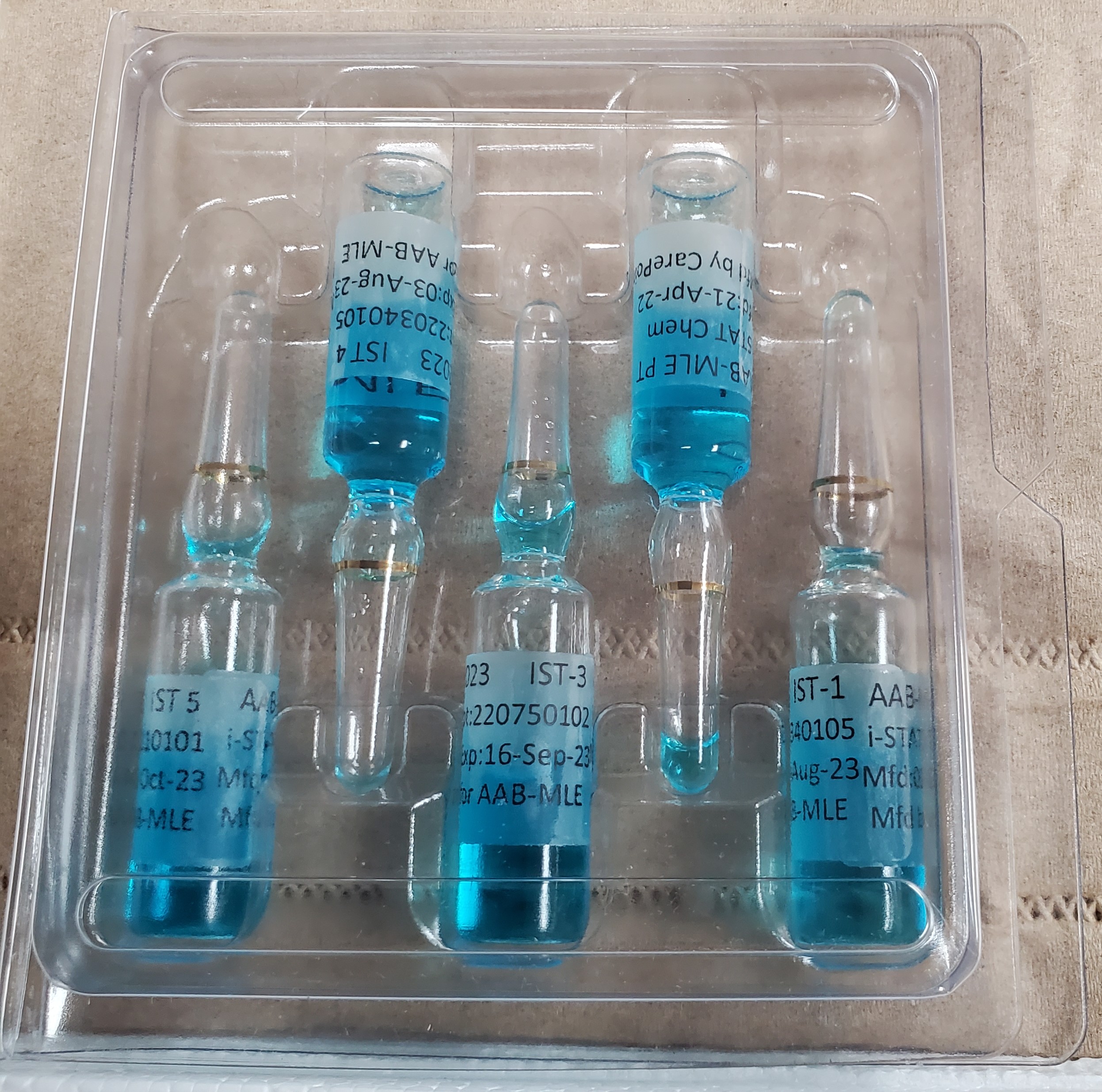 b. Syringe Transfer: Insert a 20 gauge, 1 inch needle fitted to a clean, gas-tight syringe into the specimen. Aspirate solution slowly from the bottom of the ampule to avoid entrapping air bubbles. Expel one or two drops through the needle, detach the needle from the syringe and immediately transfer specimen into the cartridge port.