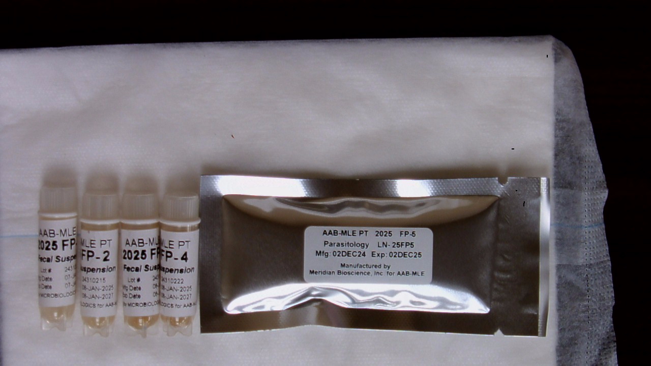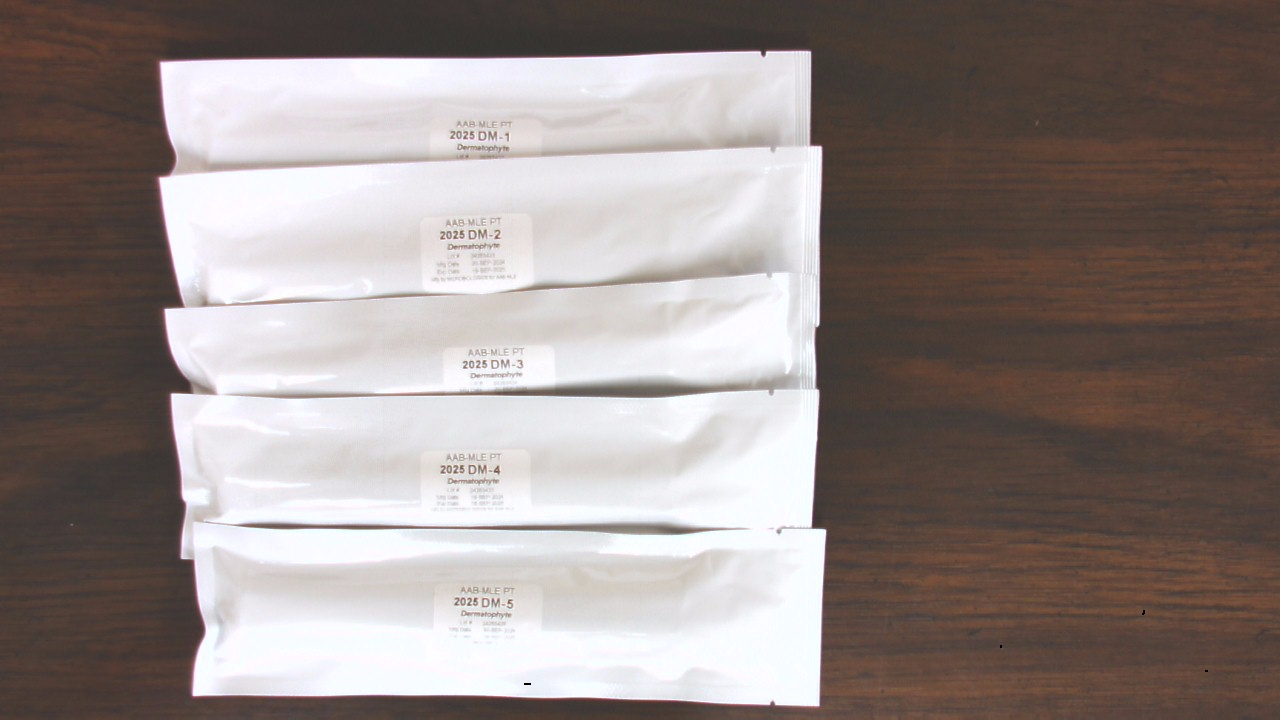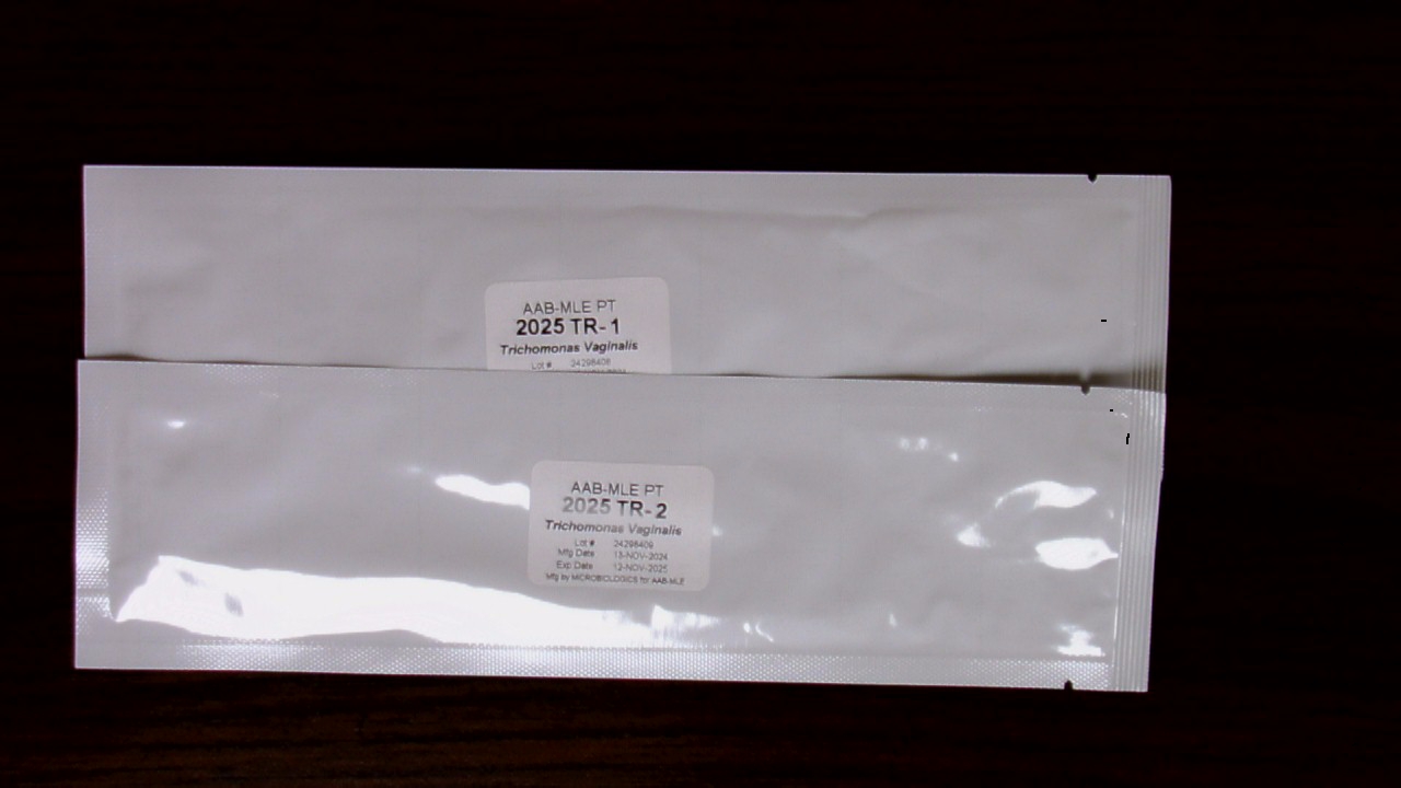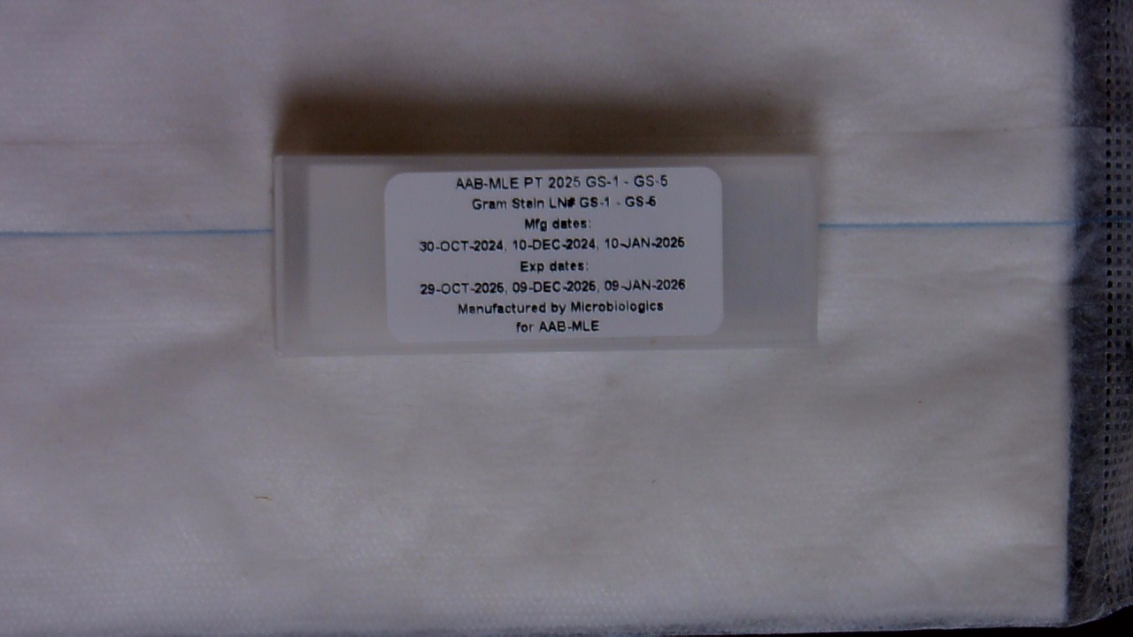 These specimens will only be included in the first and third shipments. Each sample is a formalin‐fixed prepared glass slide for Acid Fast Stain. Perform the Acid Fast Stain procedure on each sample as you would a patient sample.